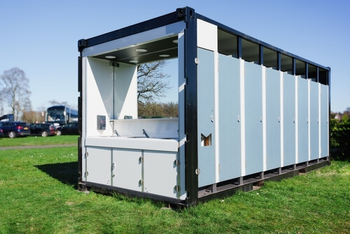 Amodernmobilerestroomwithmultiplestallsrunningwaterfor 2
